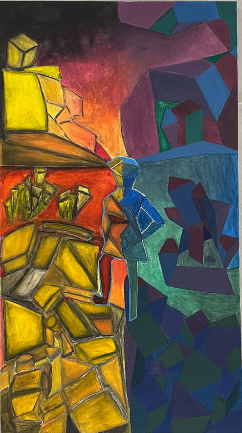 Der Kubismus ist eine Kunst, die auf spitzwinkligen Facettierung der Naturformen (3D oder 2D) basiert, die ein in sich stimmiges Bild ergeben. Wir haben uns inspirieren lassen an dem bekannten Gemälde „Der Wanderer über dem Nebelmeer“ von Casper David Friedrich. Unsere Überlegung war, das Bild in zwei Bereiche aufzuteilen und diese jeweils in die kubistische Malweise umzusetzen. Nachdem wir es erst mit Kohle vorgezeichnet haben, fingen wir an jeden der beiden Bereiche in eine unterschiedliche Stimmung zu setzen, indem wir uns auf einer Seite auf die Stimmung des Sonnenuntergangs im Sommer und auf der anderen auf die tiefe sommerliche Nacht fokussiert haben. Somit wird die linke Seite in tief rötlich, orangenes und gelbes Licht getaucht, während die rechte Seite des Bildes in dunklen lila,blau und grün Tönen versinkt.