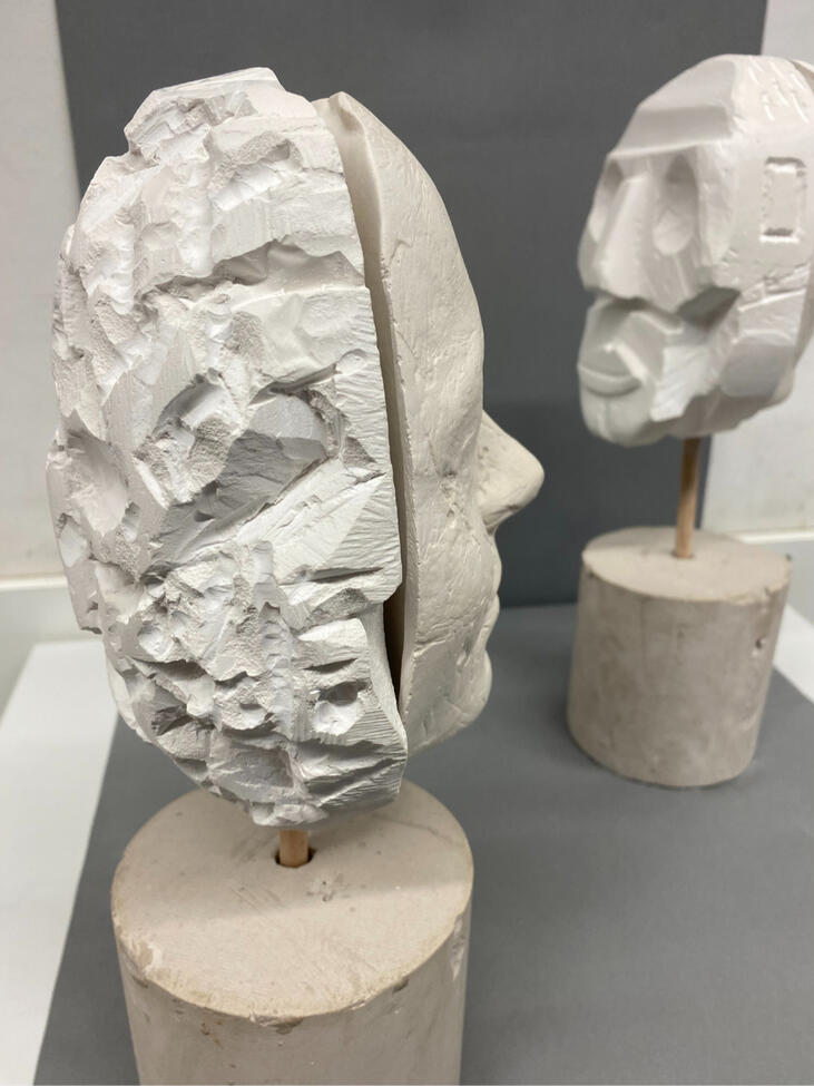 Nach und nach haben wir Gesichtsabdrücke angefertigt und verschiedene Gipsformen gegossen. Um die Abdrücke in Form zu bringen und kubistische Formen, wie Zylinder, Würfel und Pyramiden, mit einzuarbeiten, haben wir vor allem Hammer, Meißel, Feilen, sowie Schleifpapier verwendet. Zuletzt wurden die fertigen Masken bzw. Gesichter von der Hinterseite eingebohrt und dann mit Holzstäben aneinander befestigt. Dadurch stehen sich Realität und Kubismus, in einer Statue, direkt gegenüber.